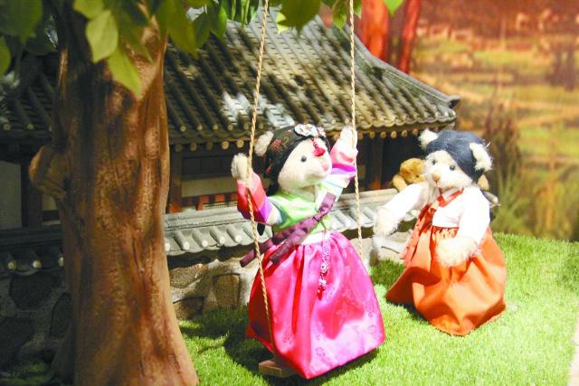 正如小熊的传统婚礼,各个博物馆设置了很多介绍韩国传统风俗的展示,包括四物游戏、踢毽子、荡秋千(如图①)等,并还原了古代王朝、热闹市集等景象。让泰迪熊穿上韩国传统服饰,并将其置于微景观中,把古代韩国的代表性生活场景进行还原。给游客的感觉,就是泰迪熊可爱、精致,而且新奇之余,还有种对韩国历史、风景名胜和传统文化的带入感。