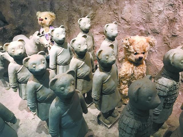 1955年美国迪士尼乐园开业,1969年人类第一次登月,1974年发现兵马俑,1981年英国王储查尔斯王子与戴安娜王妃世纪大婚,1989年拆除柏林墙,1997年香港回归……人们可以通过泰迪的视角,回顾泰迪诞生至今100多年间的世界重大历史事件。小熊们穿着当年的服饰,拟人化的神态,煞有介事。特别是兵马俑考古现场的画面,不仅每个兵马俑造型都“变身”成为泰迪小熊,俑坑中,手持刷子、拿尺测量、做记录的“考古小熊专家”的认真模样,让记者看得很是津津有味。