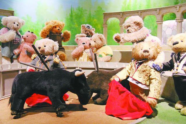 韩国不少泰迪熊博物馆均开设了国别展,展现世界各国的地标建筑、文化象征等。扮上京剧装的中国熊,日本名古屋城前的小熊相扑,泰姬陵前身着传统纱丽的印度小熊,美国胜利女神熊,大本钟下的英国皇家卫队小熊,西班牙的斗牛士小熊(如图④),巴西狂欢节上的小熊们着装性感,俄罗斯红场上巡逻的士兵小熊们头上积了厚厚的雪……